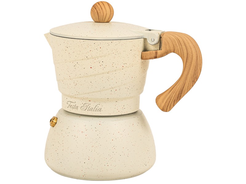 Poznaj urok włoskiej tradycji parzenia kawy z wyjątkową kawiarką Festa Italia Marietta – połączeniem klasycznego designu i nowoczesnych rozwiązań. Ta aluminiowa kawiarka moka została zaprojektowana z myślą o estetach i smakoszach – zachwyca kremowym kolorem z delikatnym kropkowaniem oraz stylowym uchwytem o wyglądzie naturalnego drewna.